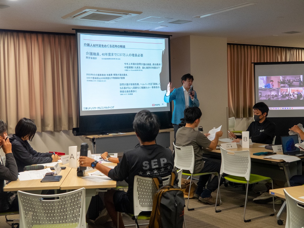 5日目は、超高齢社会におけるビジネスのあり方について、岩名さんにご講演いただきました。今回は、菊池市のKiCROSSを会場に、きくち、やまがの2つの塾が現地参加し、あそ、やつしろ、なんと、こまつの4つの塾がオンラインで参加しました。講師の岩名さんには、毎年塾で講義いただいています。